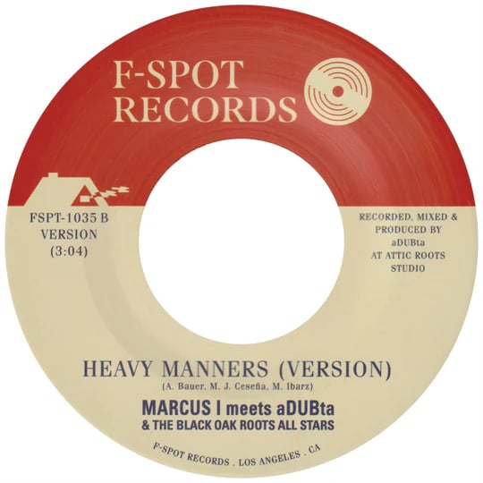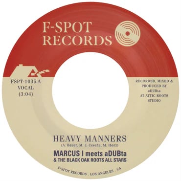 With summer in full swing, F-Spot Records is proud to announce their next grooved-filled 45, 'Heavy Manners' from Germany's leading authentic reggae team, 'Marcus I meets aDUBta'. Influenced by US Soul and the early Reggae and Rocksteady sounds from Jamaica, aDUBta, a producer and musician from Bavaria, Germany, linked up with Marcus I, a Southern France notable songwriter and singer in the Roots-Reggae scene, to create a collection of work inspired by the Studio One sounds of the 1960s. Following their debut 'CUT A WIRE Showcase' (Hornin' Sounds Records, France - 2023), 'Marcus I meets aDUBta' kick off their next set of releases with this uplifting, flying-cymbal-style 7-inch that's an automatic vibe setter and head nodder. Featuring a minimalist riddim 'Version' on the B-side, DJs, you know you'll need doubles!